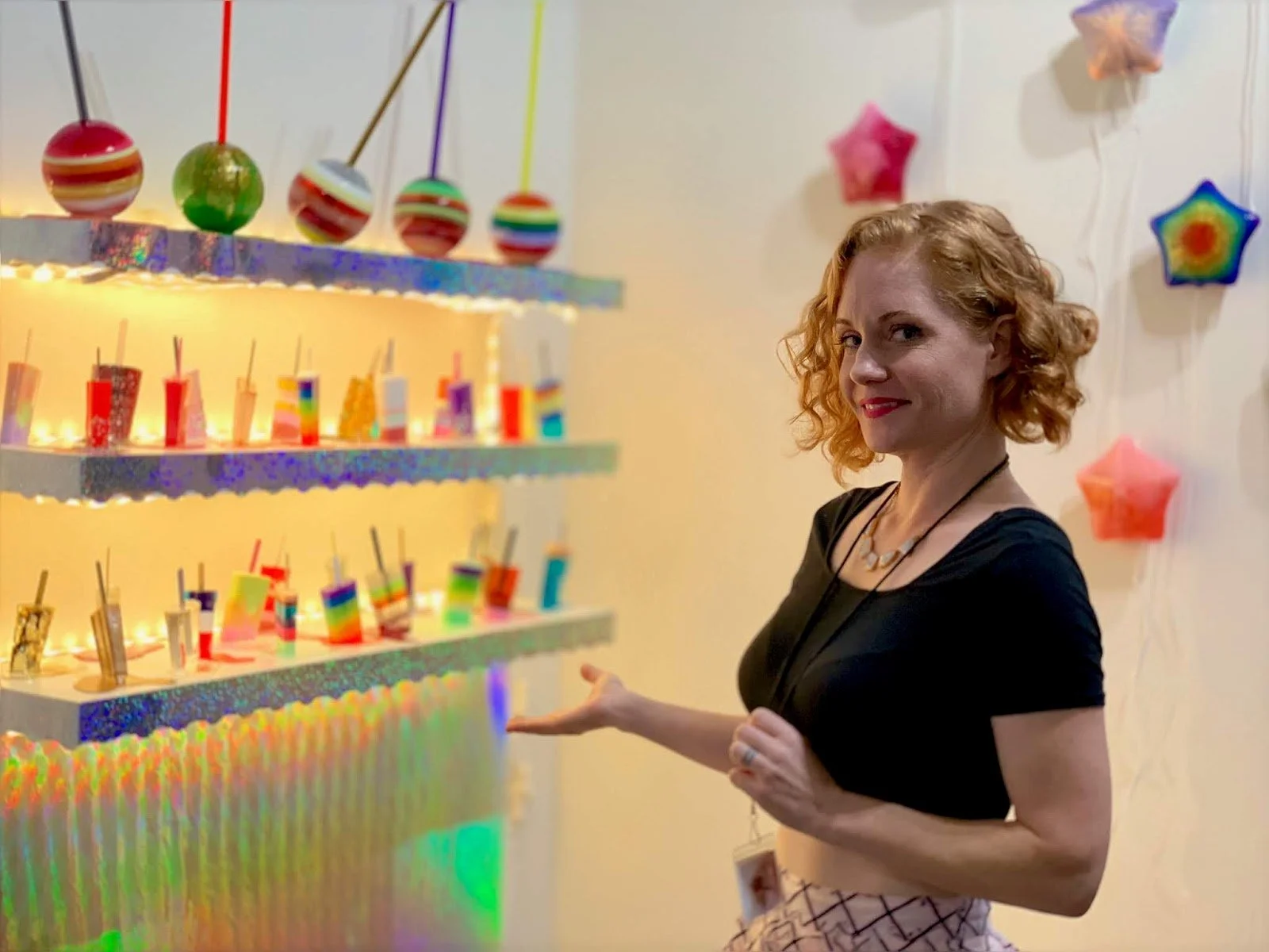 Betsy Enzenberger has become quite well known for her realistic, larger-than-life sculptures of dripping, frozen treats and other sweet-toothed delights. Resin looks like candy. It looks delicious and sweet. The shiny exterior has a wet, melting quality. Her Melting series relies on the child-like lure of sweet, sticky lollipops and popsicles to artificially instill intense desire. The colorful confections practically beg to be rescued and consumed.