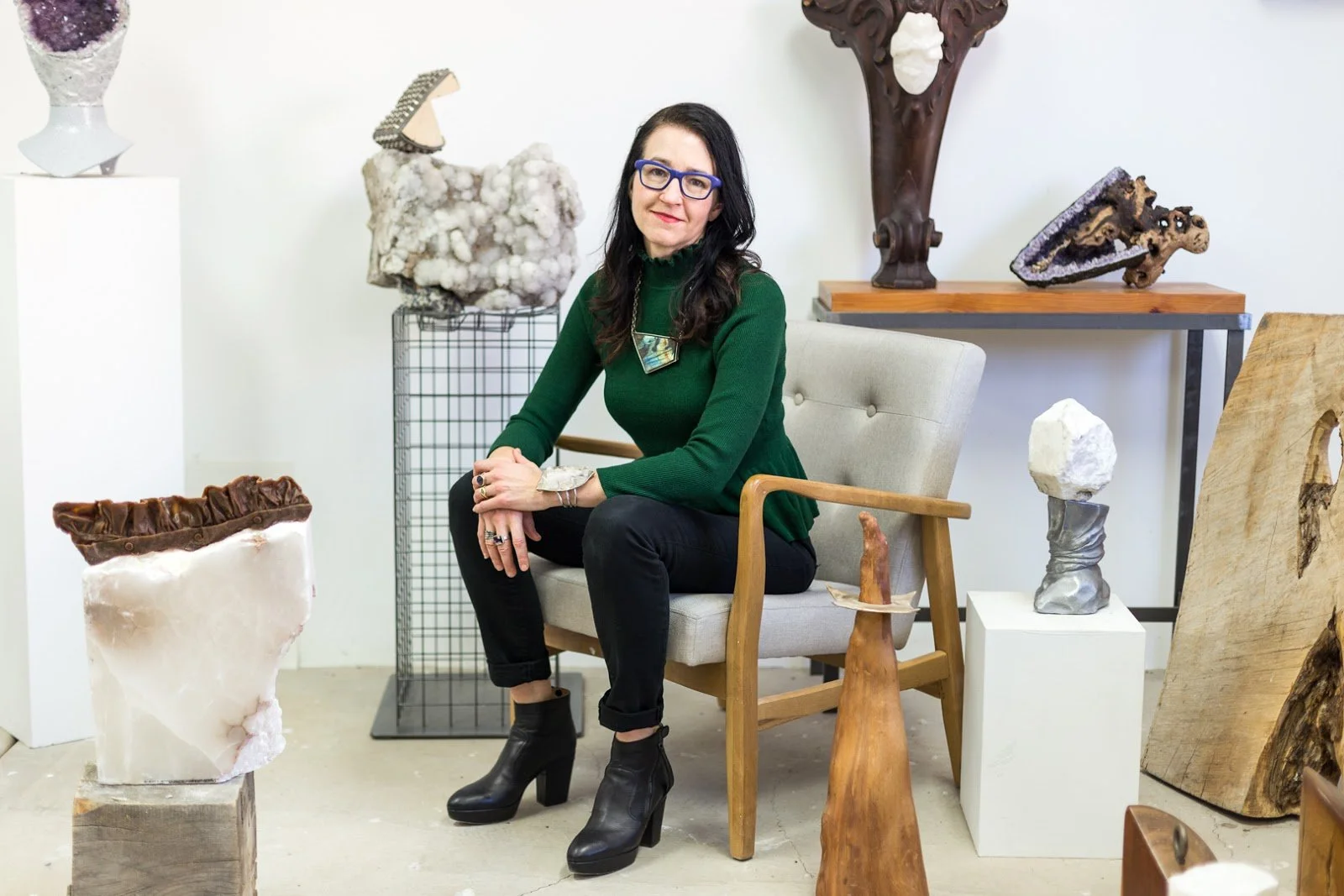 Debra Baxter is a sculptor and jewelry designer who combines carved alabaster with crystals, minerals, metals, and found objects, exploring notions of power, vulnerability, empowerment, success, and failure.
