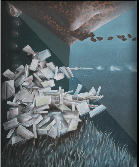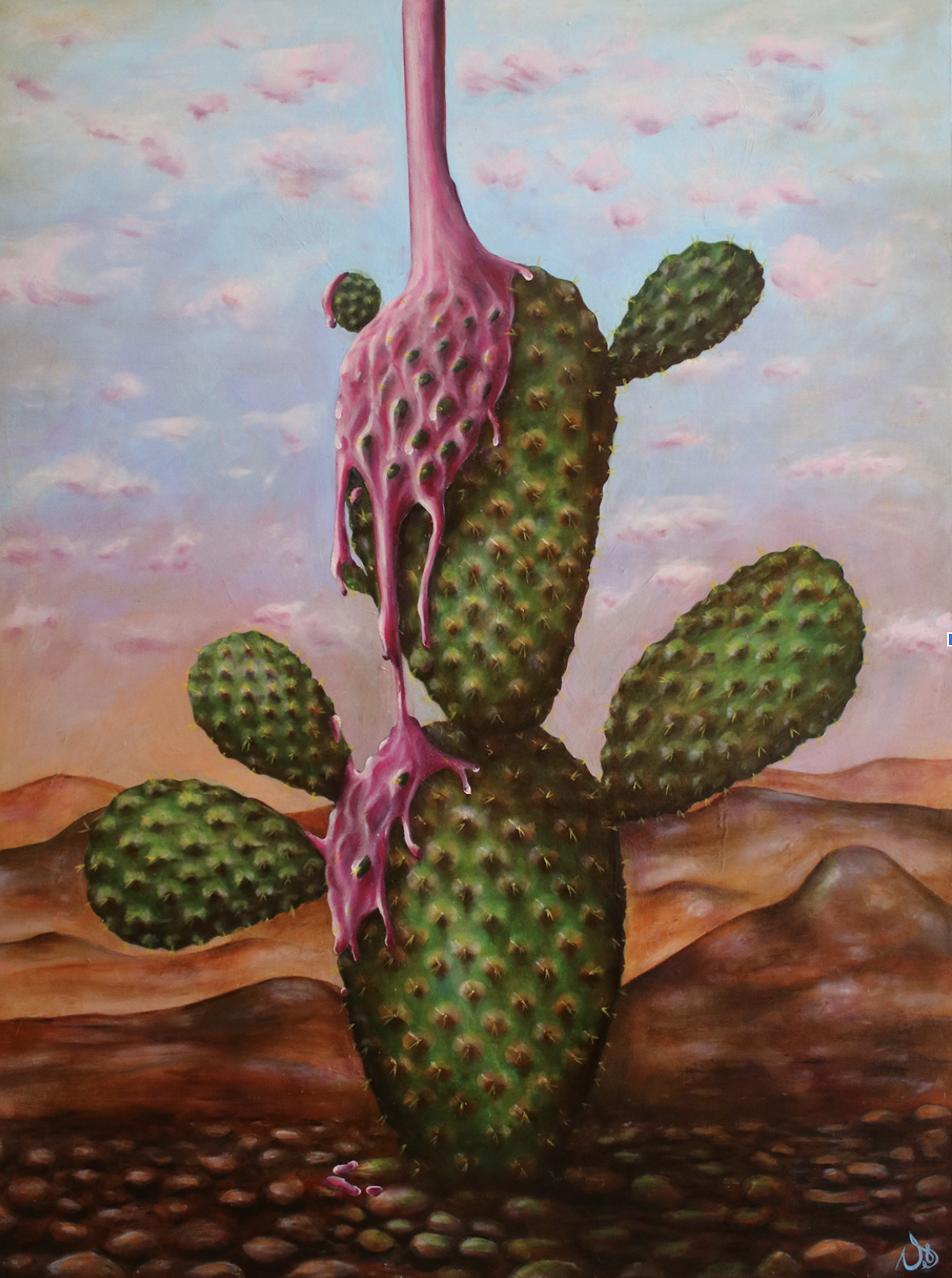 VS: I love painting cactuses and pears. I think it’s the green in them and the depth I can create with their textures. In my artworks green has to be used strategically so it doesn’t resemble an alien, but if I get it right then I really enjoy the green. My favourite painting, ‘Trauma’ is still the best cactus I’ve painted, it represents a person going through a hard time (the paint being poured on the cactus) and just having to grow through it, like the cactus does. I’d like to place myself in a position where I can really focus on an artwork, deeply so that I can create something with just as much skill as the first time. A cactus (or pear) is to me, as an apple is to Magritte.