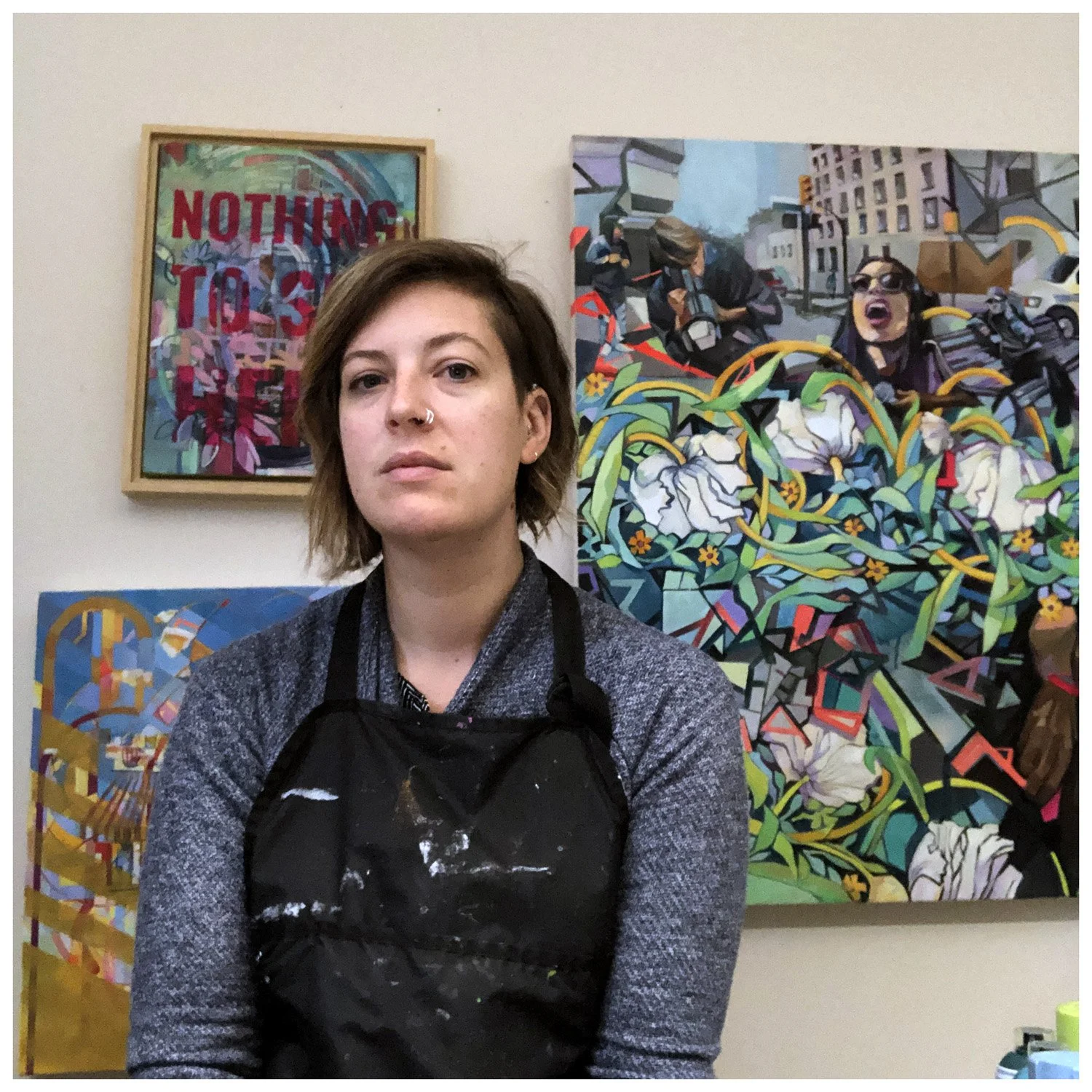 After becoming a mother, I started, for the first time ever, to think about this world objectively through the eyes of a newcomer. The filter we apply to experiencing the world, I imagine, is not all that different to how the canvas is handled. Formally, my paintings explore the tension between geometric abstraction and organic shapes. While I never usually have a specific plan when I start painting, the experiences, however mundane and routine, become part of the entire picture. Graphic elements, blocks of color, and formulated environments create a layered reality that challenges the ideas behind “Progress” as we face serious challenges to our planet, our society, and within the confines of our own space. My goal is to get others to look at the world more closely around them and use their intellect and imagination to discover familiarity in unusual places.