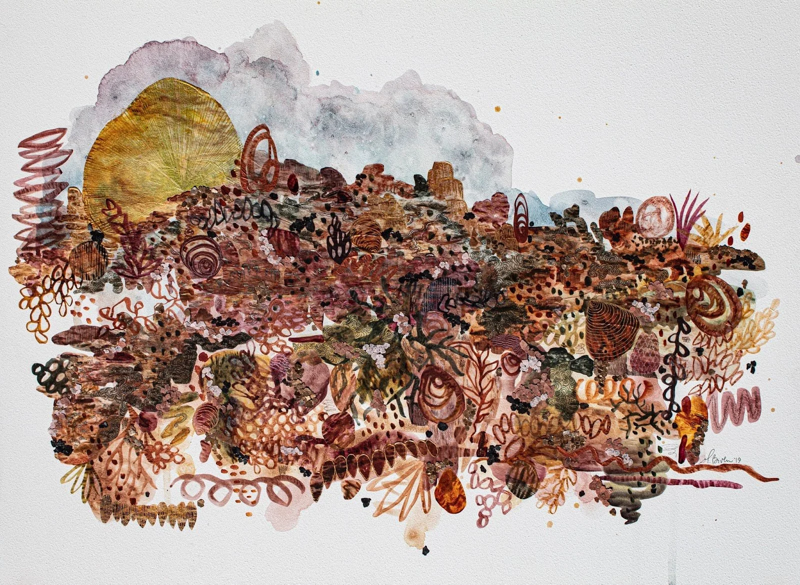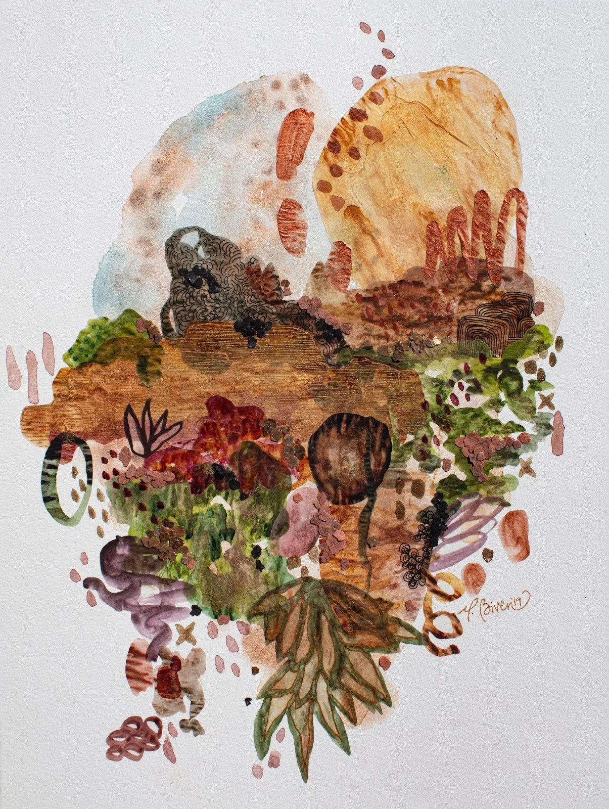 My work is a celebration of the natural world. Meant to be fun and reverent at once, these multilayered collages are places for the viewer to get lost. Made up of layers of painted vellum, hand-drawn details, and accents of light-catching flakes of mica, these magical landscapes twist and wind their way toward the horizon, and toward that sense of the sublime that one feels when looking out into the wilderness.