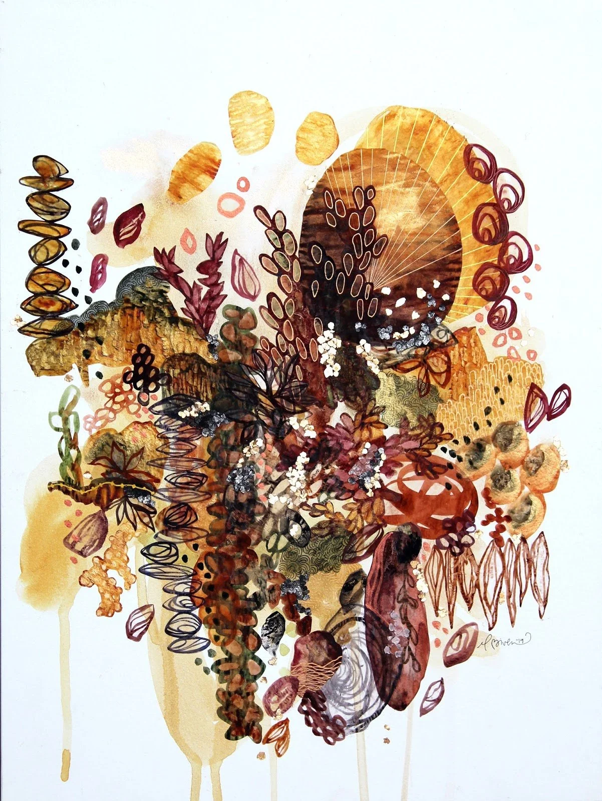 Brush strokes, mark making, washes of color, exposed supports and splashes of gold capture the dreamy worlds created by Marissa Biven. She uses mixed media work to celebrate and explore nature.