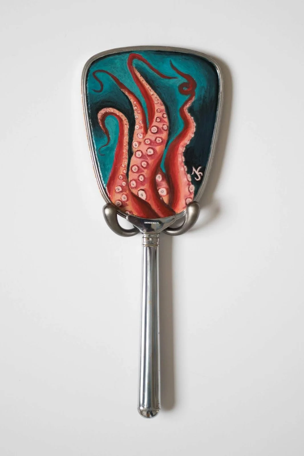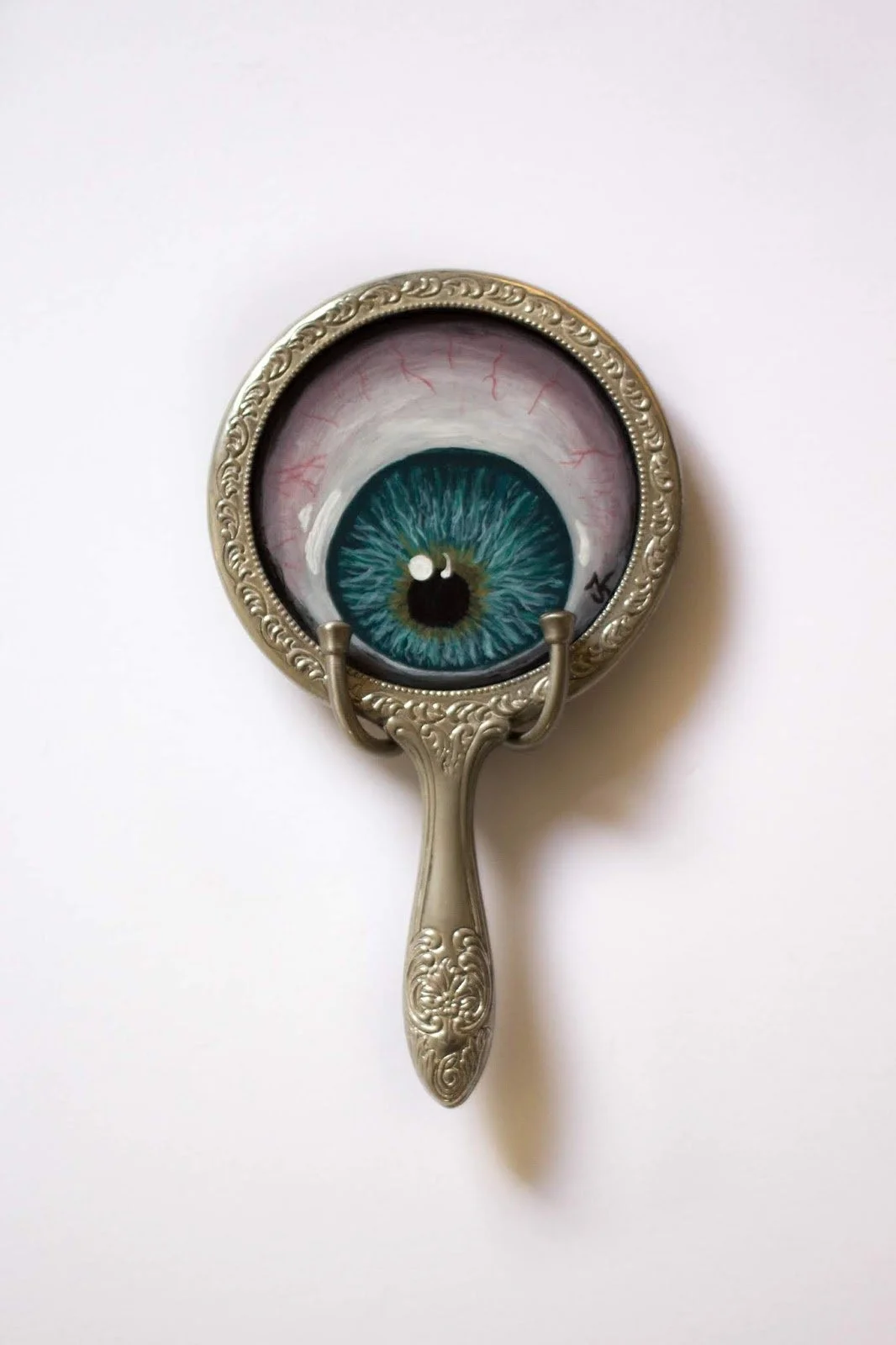 Remember what we mentioned the other day about being jealous of artists who create three-dimensional work that the user can interact with? We discovered the work of a Nicole Sanabria, who paints on vintage mirrors. She paints beautifully rendered images on repurposed antiques, creating a stunning juxtaposition between a modern and vintage imagery.