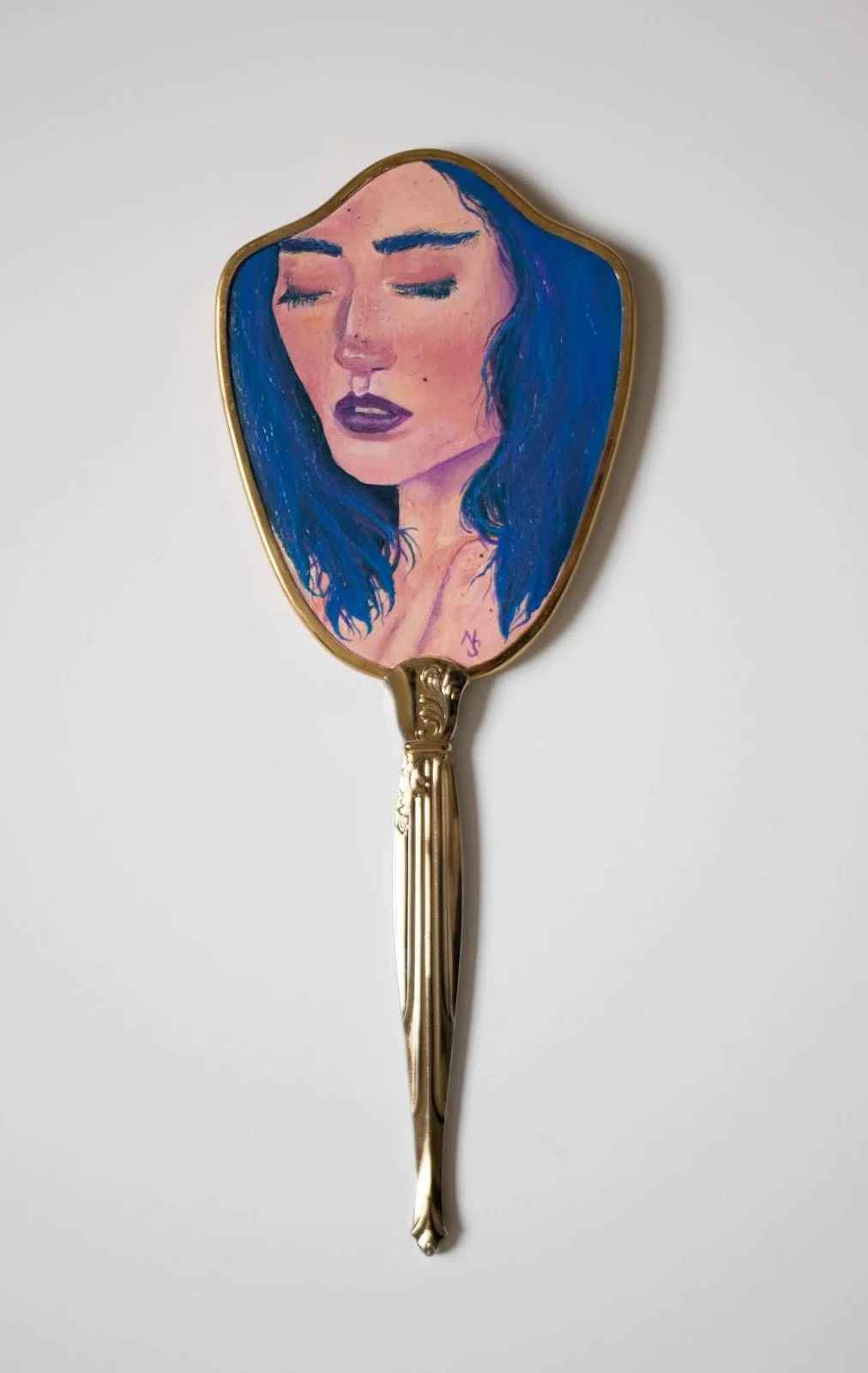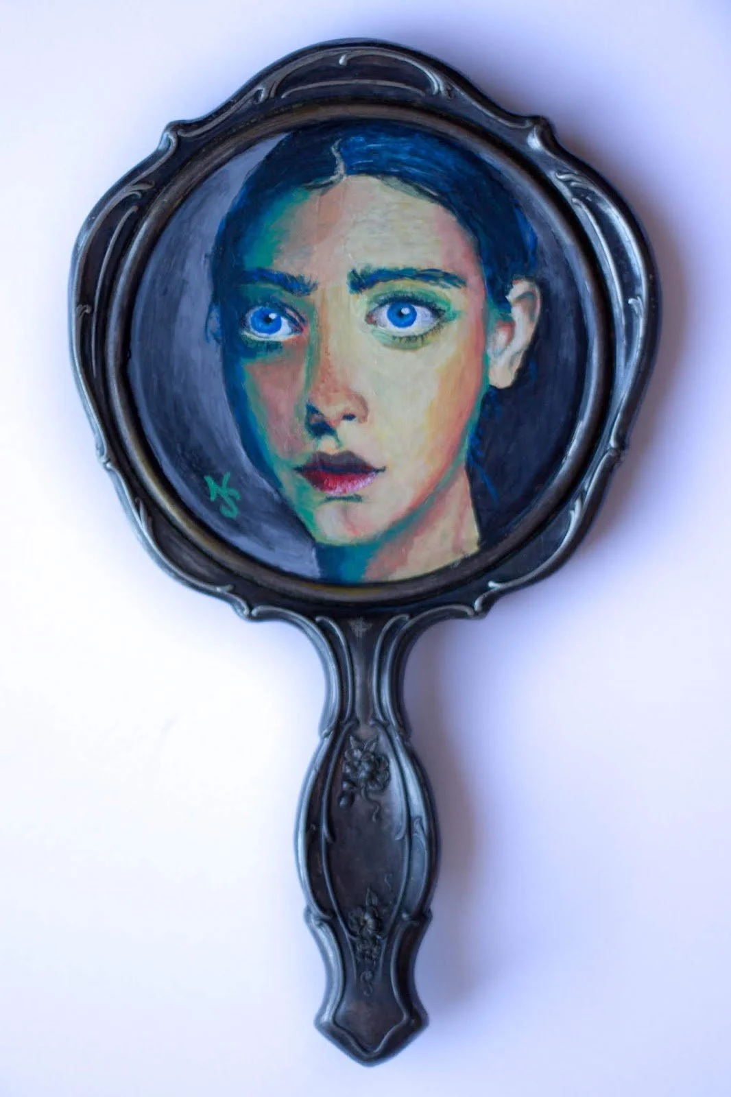 She was struck by an idea to extend her art beyond the canvas and the result of this idea is her current series "Mirrors". This series is the transformation of antique hand mirrors into backdrops for her paintings. She explores the pairing of frame to scene, and letting the subject extend beyond the glass. By finding these old items she breathes a new life into them.