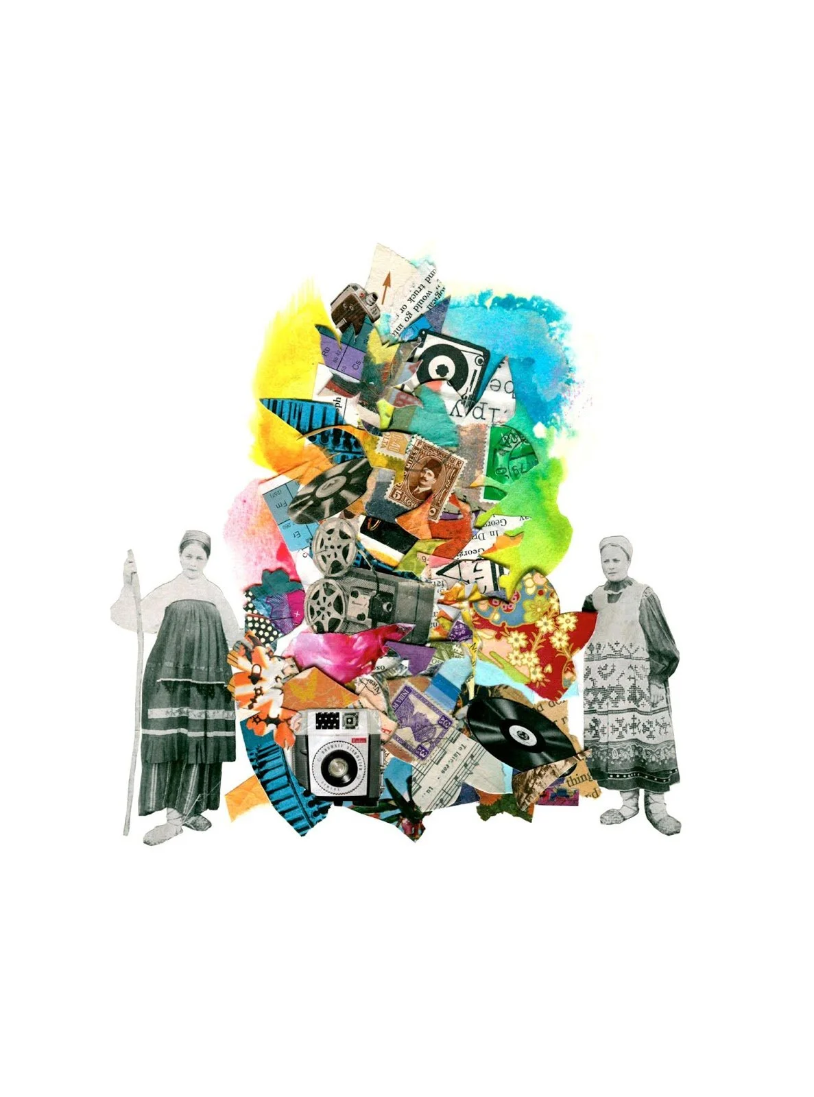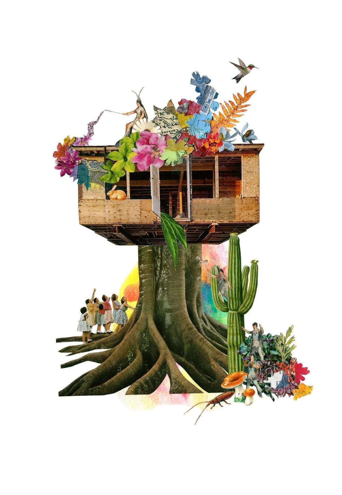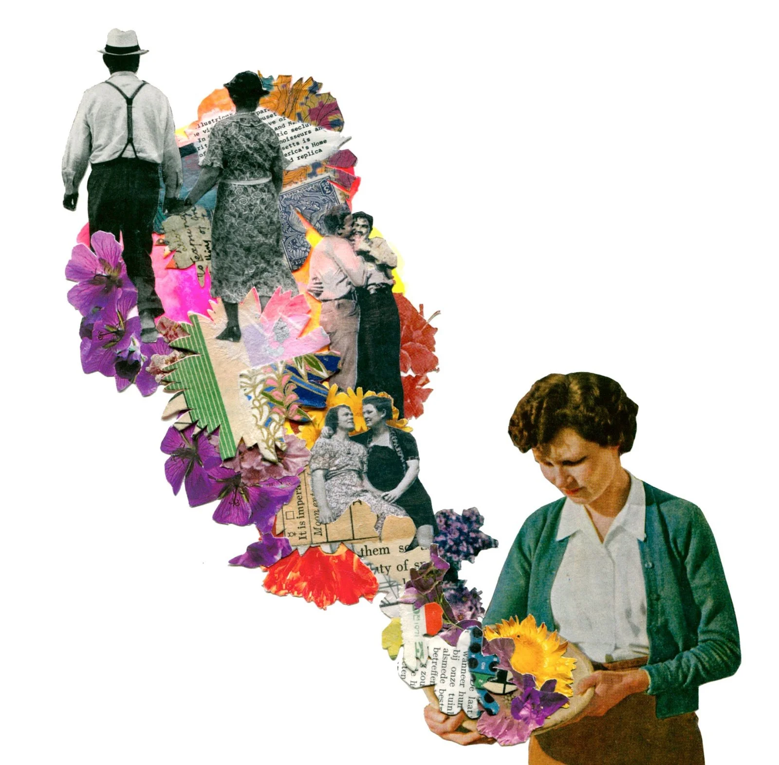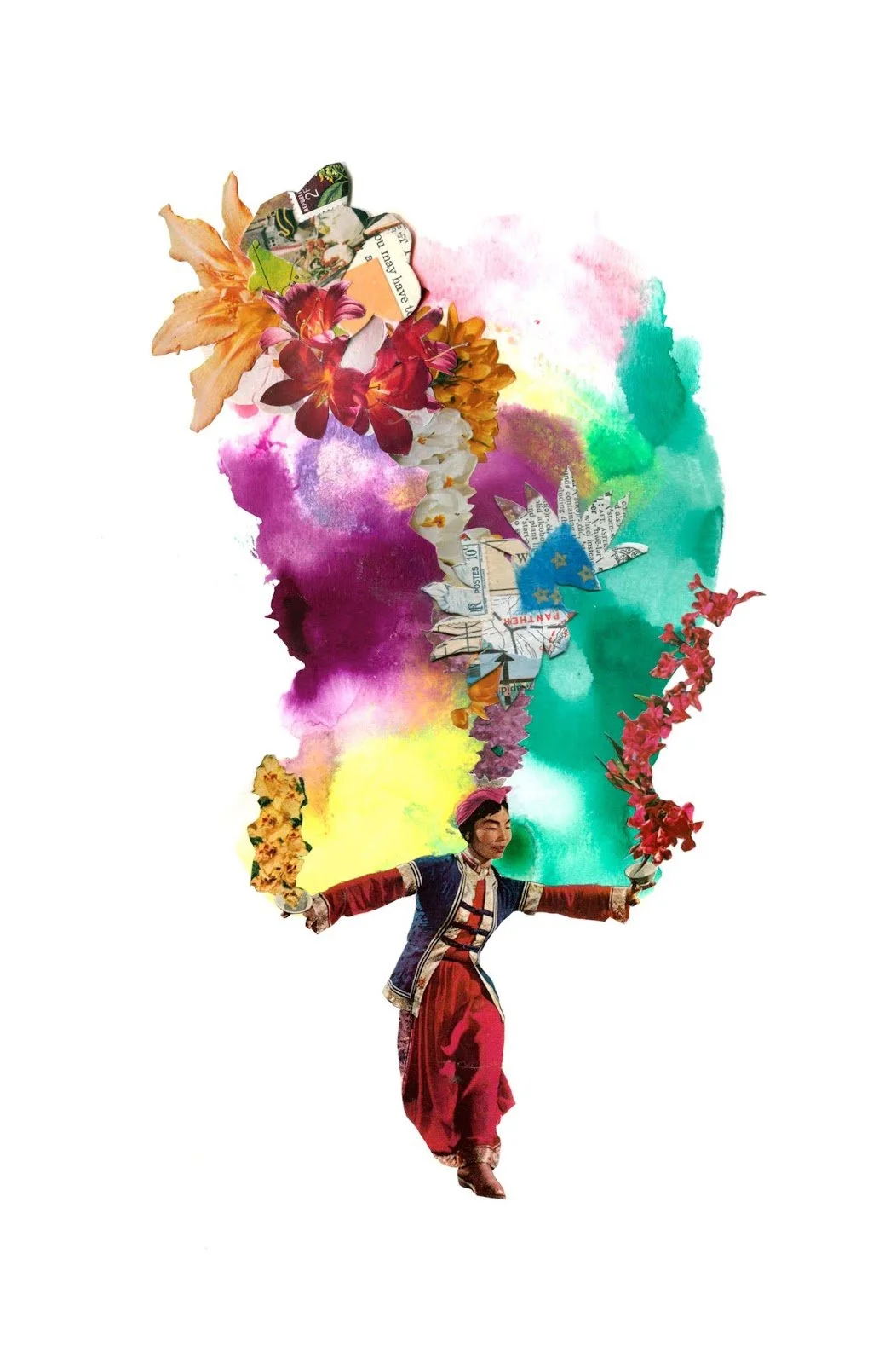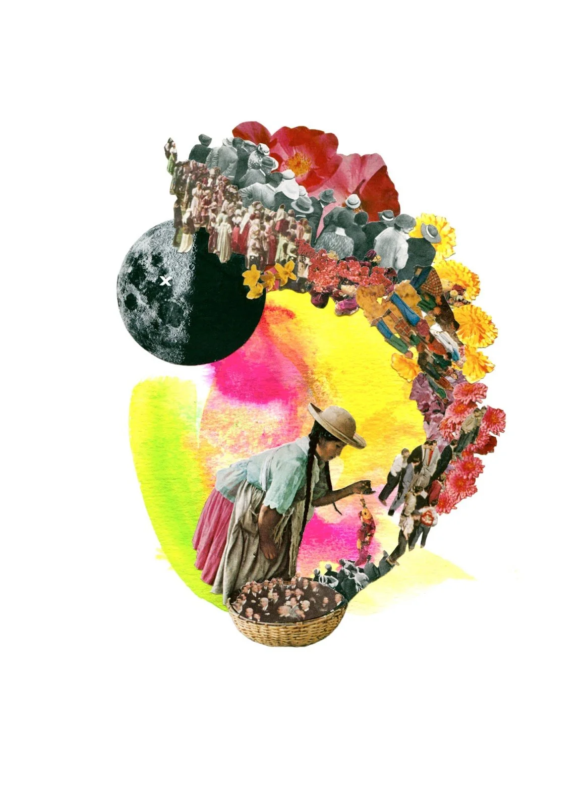 Working primarily with vintage print material, Schinners combines hand-cut collage with vibrant splashes of color to bring new life to old images. She looks to explore and express fleeting moments of magic, alchemy, and the shifting nature of the internal landscape. One particular definition of alchemy is ‘a seemingly magical process of transformation, creation, or combination’. This alchemy can also be thought of as the invisible energies that surround us, things we cannot see which can make us feel connected or disconnected to the people and places we interact with. Schinners’ attempts to make that unseen energy visible, whether as magical blooms of flowers, crowds of connected people, or bursts of raw color. Recent work has celebrated and reflected traditions of folk magic and brujeria, as a nod to the empowered ‘wise woman’ archetype.