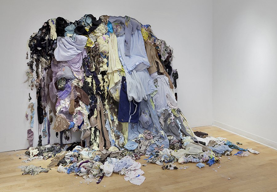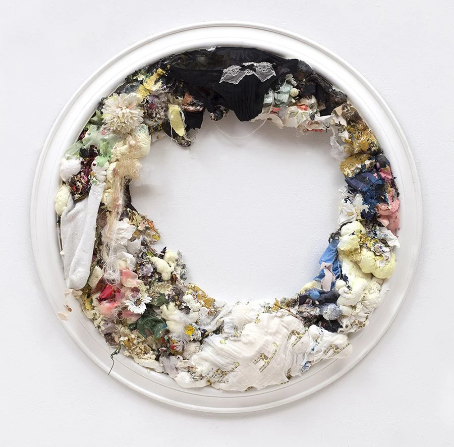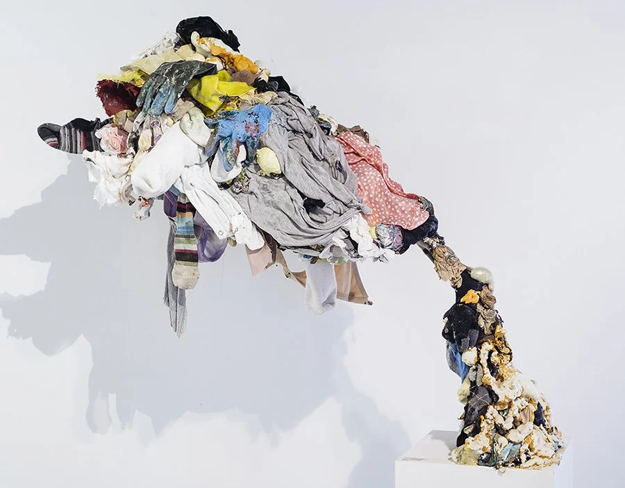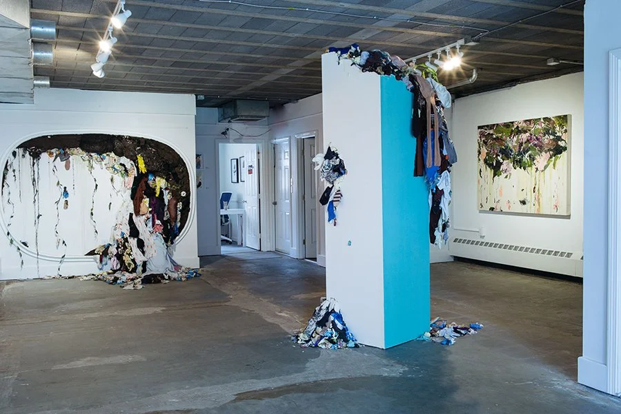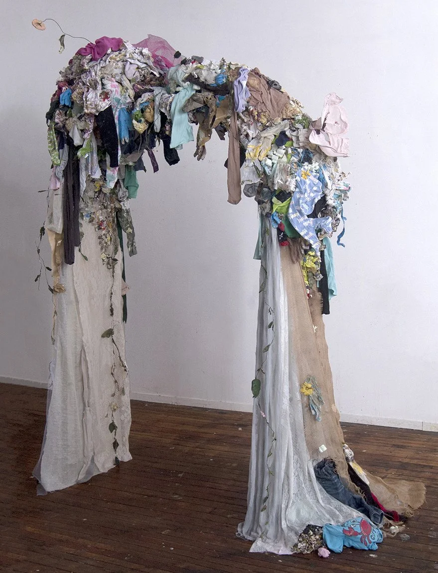 I make mixed media works to take the craziness of motherhood (and life in general) and to create something beautiful out of it. My installations use all of the debris from my house and studio, including old kids’ clothes, paint globs, packing peanuts, rags, pieces of old projects, and gloves. There is a beautiful richness to these materials, which are otherwise considered trash. I want the work to feel alive: simultaneously growing and decaying. I incorporate the fabric and debris with dirt and other natural elements.